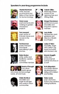 The theme is Words in The World and you’ll be exploring the power of words to change yourself and the world. To inspire you there will be Seeds of Thought, an urban poetry group who share words, art and music; Valerie Gillies, the former Edinburgh Makar and Ted Bowman of the National Association for Poetry Therapy (USA).
