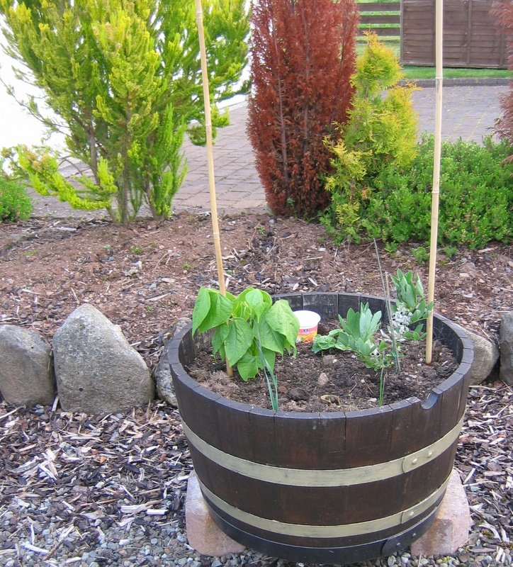 Champion the Bean on the right of the barrel. The plastic tub is the beer trap I put out to give the slugs a happy time and keep then off the beans.