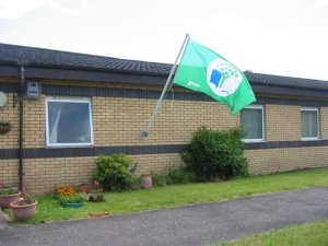 The Eco Flag flies above flowers donated earlier in the day by a local gardener.