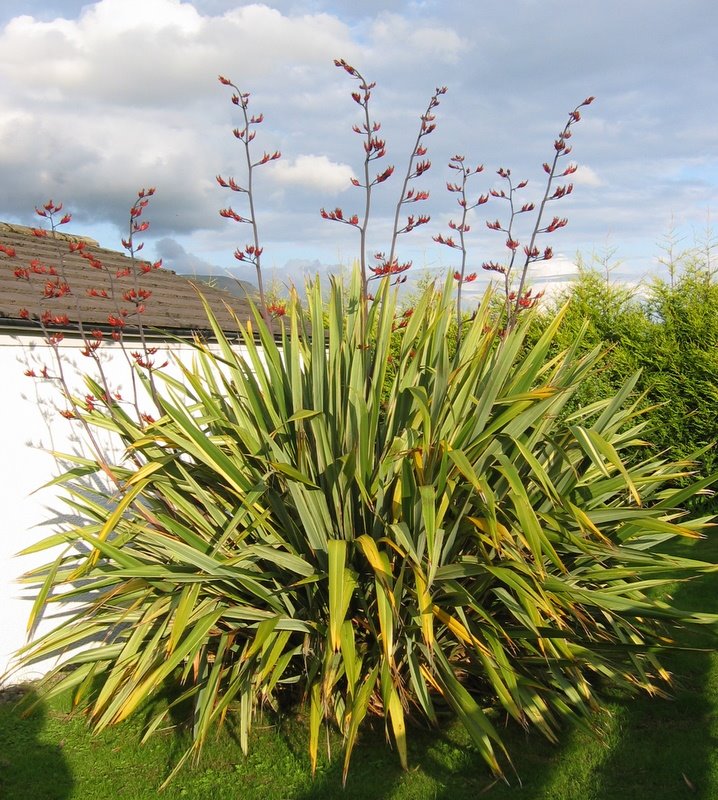 My garden was well tended while I was away, but what a sight met me on my return. The New Zealand Flax, which has been cursed as a waste of space by our household’s chief grass cutter (not me) has been busy producing flowers. I took this photo last week, I think it has grown another two feet since then. The flowers are burgundy, almost black and the bees and butterflies are having a nectar feeding frenzy; apparently this plant is packed full of the stuff. I wonder if global warming will bring humming birds to Scotland?