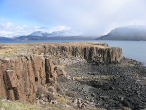 Balsalt Columns with snow moving in behind from Ben More – Ulva, Mull