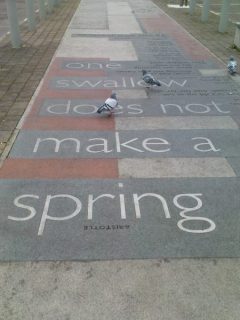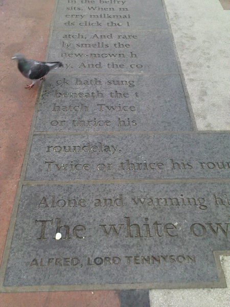 A recent trip to Morecambe, Lancashire, provide me with an unexpected encounter with a Flock of Words. I left the newly refurbished, Art-deco Midland Hotel on the promenade and prepared myself for a dreary walk to the library in the rain. But when I crossed the road from the hotel I stepped onto a pavement of poems. A Flock of Words, by why not associates is a 300 meter pavement of poems that stretches from the promenade to the town center. I delighted in stepping through The Owl and The Pussycat, tiptoeing around Three women and a goose a market makes. From Chaucer, to Wordsworth, Shakespeare and Roger Mcgough, the poems flew. The theme of birds may have been overlooked by locals hurrying to work but the pigeons and I had a word fest.