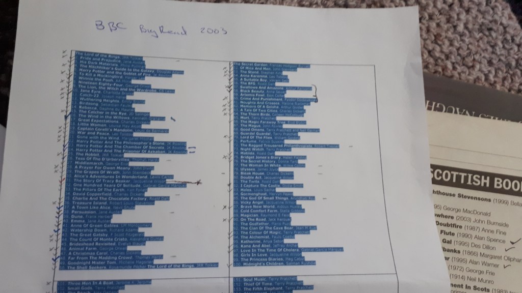 That was my classics list sorted or so I thought. Halfway through the year a TV series Novels That Shaped Ours World was aired, and with it came another list, this time from 2019. The list of books were decided on by a selected panel of writers and was divided into categories like Identity, Adventure, Class and Society, Rule Breakers etc. I went through the same process, ticking the ones I had read. Thankfully, there is some cross over with the Big Read list but many on this new list are in series form; Disc World, Sandman, Harry Potter and The Twilight Series to name a few. I knew I wouldn’t be able to (or want to) read them all, but I keep the list by the other one and dip into it now and again. I also have a list of Muriel Spark’s books and The List of Best Scottish Books from 2005, but that needs updated.